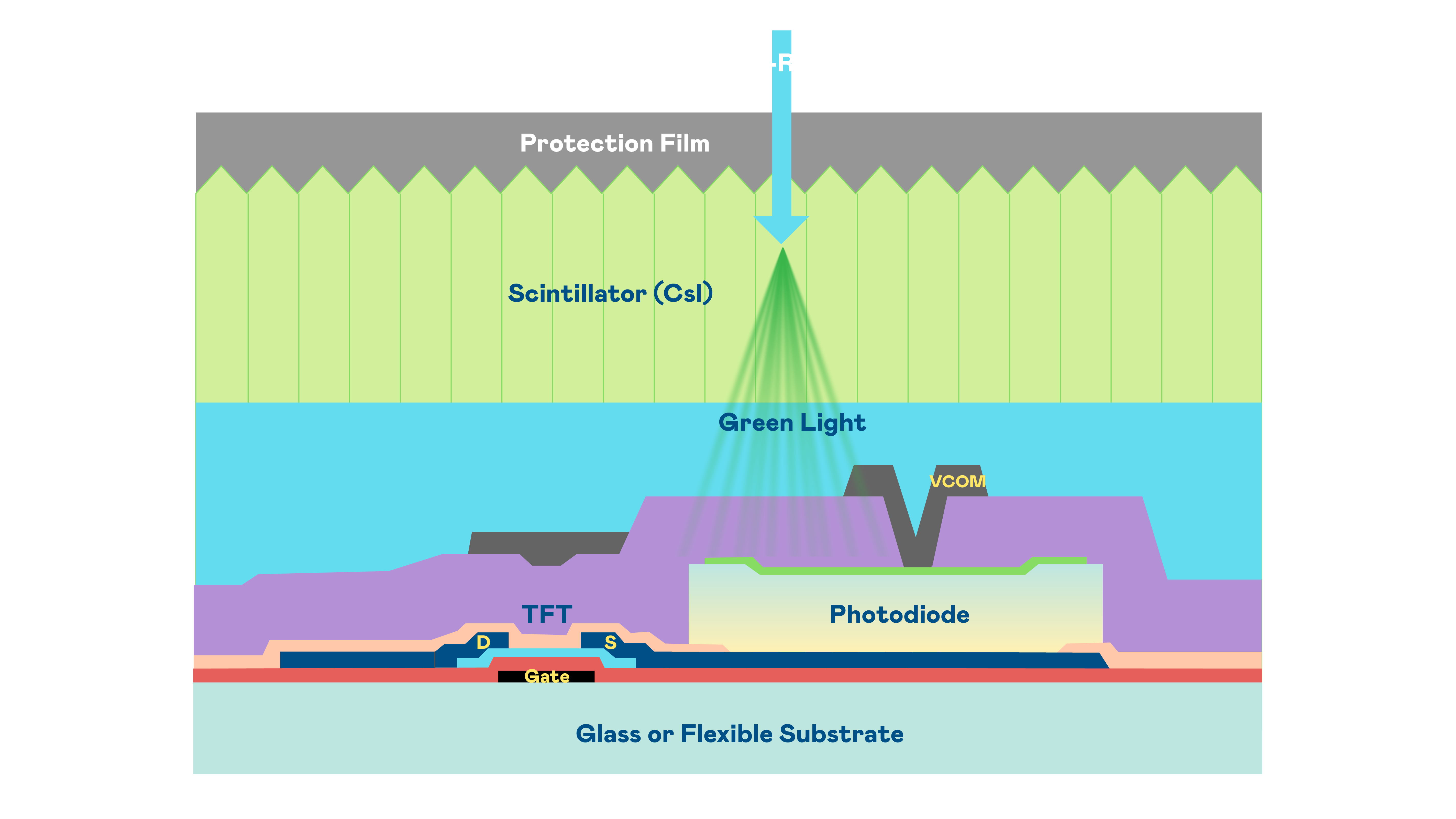 6686体育的X光影像感测阵列使用薄膜电晶体 (TFT) 作为每个像素的读取开关,搭配光电二极体(Photodiode)的光电转换元件,用以感测X光影像讯号。